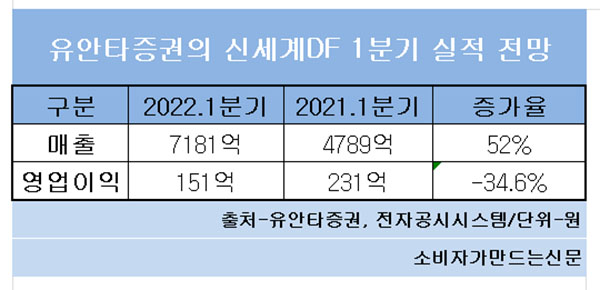 유안타증권은 신세계디에프 올해 1분기 매출을 작년 동기 대비 52% 증가한 7281억 원으로 전망했다. 하지만 영업이익은 34.6% 감소한 151억 원으로 예상했다.