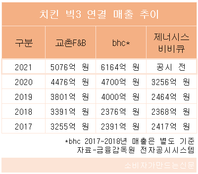 bhc·교촌F&B와 함께 치킨 프랜차이즈 빅3으로 묶이는 제너시스 비비큐(회장 윤홍근)는 2019년 2464억 원, 2020년 3256억 원의 연결 매출을 냈다. 지난해 감사보고서는 아직 제출하지 않았다.