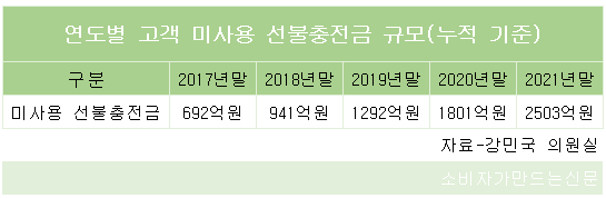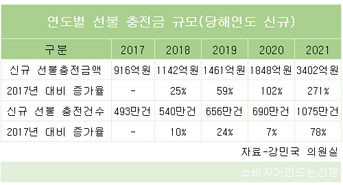 5년간 당해연도 신규 선불 충전건수는 △2017년 493만 건 △2018년 540만 건 △2019년 656만 건 △2020년 690만 건 △2021년 1075만 건으로 매년 늘고 있다.