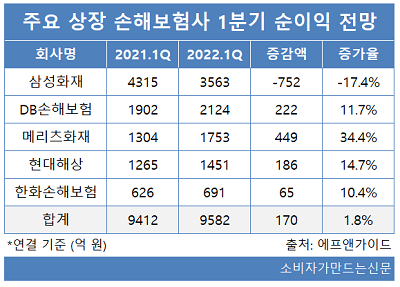 25일 에프앤가이드에 따르면 삼성화재, 현대해상, DB손해보험, 메리츠화재, 한화손해보험 등 상장 손해보험사 5곳의 별도 기준 당기순이익은 9582억 원으로 전년 동기 9412억 원 대비 170억 원(1.8%) 증가할 것으로 집계됐다.