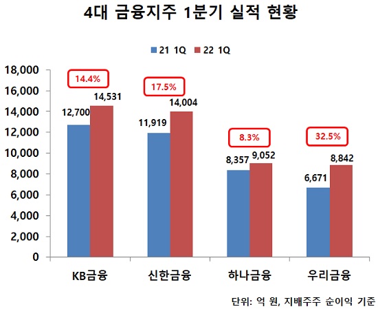 4대 금융지주는 올해 1분기에도 '역대급' 실적을 쏟아냈다. 당초 비은행 계열사 실적 하락 우려가 있었지만 주력 계열사인 은행에서 사상 최대 실적을 쏟아냈기 때문이다.