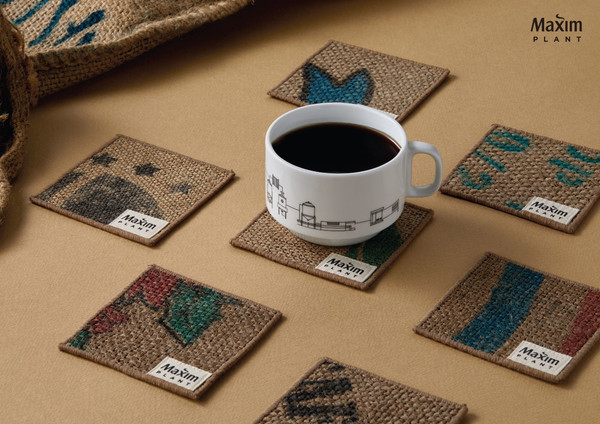 사은품은 업사이클링 브랜드 파울로앤수니와 협업하고, 10단계 공정을 거쳐 제작한 친환경 코스터(Coaster)다. 코스터란 잔 아래에 까는 컵받침을 말한다. 이는 맥심 플랜트에서 지난 4년간 원두를 로스팅한 후에 남은 커피 마대자루를 활용한 것이다.