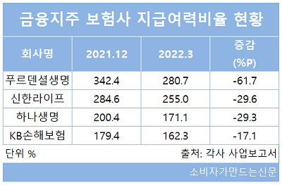 4개사 가운데 지급여력비율이 가장 높은 곳은 KB금융지주 계열사인 푸르덴셜생명으로 올해 1분기 기준 280.7%를 기록했다. 이어 신한라이프가 255%, 하나생명이 171%를 기록했다. KB손해보험이 162%로 가장 낮았다.