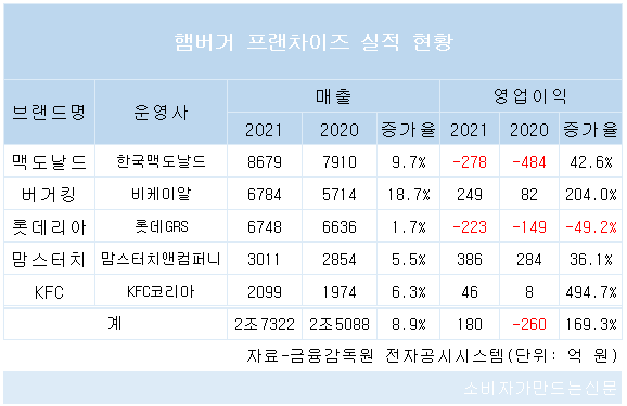 한편 5대 햄버거 프랜차이즈 운영사의 전체 매출은 총 2조7322억 원으로 전년 대비 8.9% 늘었고 영업이익은 180억 원으로 169.3% 늘리며 흑자 전환했다.