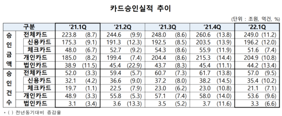여신금융협회가 28일 발표한 ‘2022년 1분기 카드승인실적 분석’ 에 따르면 올해 1분기 전체카드 승인금액은 249조 원으로 전년 동기 대비 11.2% 늘었고, 승인건수는 57억 건으로 9.5% 증가했다.