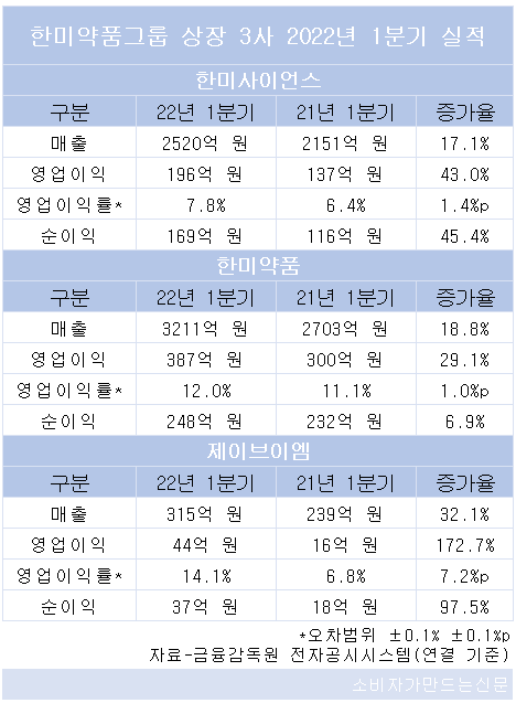 회사별로 보면 지주사인 한미사이언스(대표 송영숙)는 1분기 연결 매출이 2520억 원으로 전년동기 대비 17.1% 늘었다. 1분기 연결 영업이익은 43% 늘어난 196억 원, 순이익은 45.4% 늘어난 169억 원을 기록했다. 1분기 연결 영업이익률은 7.8%로 전년동기 대비 1.4%포인트 상승했다.