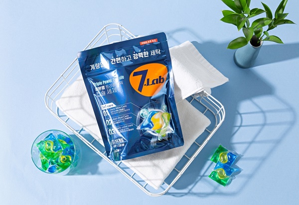 라이온코리아가 새롭게 론칭한 토털 패브릭 케어 브랜드 ‘세븐랩(7.Lab)’의 대표 상품 세븐랩 트리플 파워 캡슐 세제는 계량 없이 간편하게 사용할 수 있다.