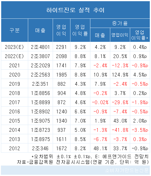 최근 10년간 영업이익 추이를 보면 2012년 1250억 원에서 2013년 1611억 원, 2014년 937억 원, 2015년 1340억 원, 2016년 1240억 원, 2017년 872억 원, 2018년 904억 원, 2019년 882억 원, 2020년 1985억 원, 2021년 1741억 원으로 줄곧 2000억 원 이하를 기록했다.