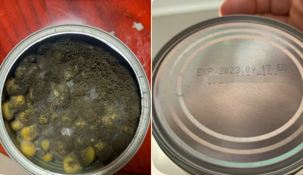 경기도 김포시에 사는 오 모(여)씨는 마트에서 구입한 옥수수 통조림을 반찬으로 먹기 위해 지난 3일 개봉했다가 깜짝 놀랐다. 노란색 옥수수 위에 먼지처럼 보이는 시커먼 곰팡이가 가득 있었던 것. 유통기한은 2023년 9월 17일까지로 넉넉히 남아 있었다.