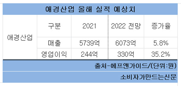12일 에프앤가이드에 따르면 애경산업의 올해 매출액은 6073억 원으로 5.8% 증가하고 영업이익은 330억 원으로 35.2% 늘 것으로 보인다.