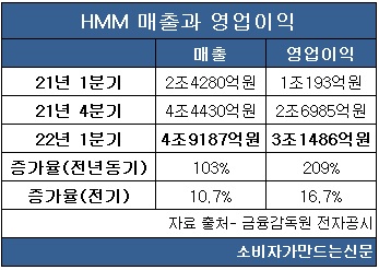 HMM의 1분기 매출은 4조9187억으로 전년동기대비(2조4280억 원) 103% 증가했으며, 영업이익은 3조1486억 원으로 전년동기대비(1조193억 원) 209% 증가했다.