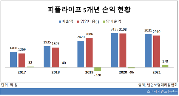 피플라이프는 2019년과 2020년 모두 적자를 기록했다. 2017년 82억 원의 당기순익은 2018년 40억 원으로 떨어졌고 2019년엔 328억 원만큼 손실을 보며 적자로 돌아섰다.