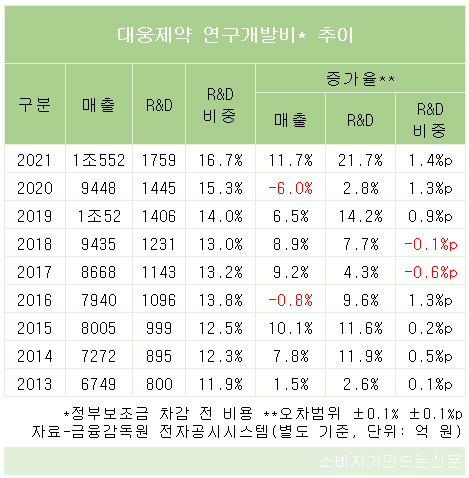 대웅제약은 최근 10년간 연구개발에 1조1553억 원을 쓰면서 투자 규모를 꾸준히 늘려왔다. 추이를 보면 2012년 780억 원에서 2013년 800억 원, 2014년 895억 원, 2015년 999억 원, 2016년 1096억 원으로 4년새 300억 원 넘게 늘었다.