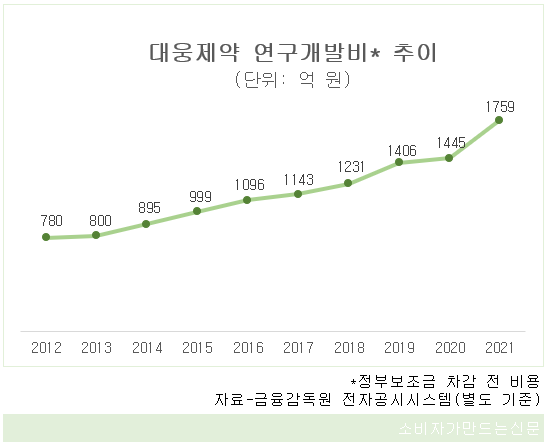 2017년과 2018년에는 1100~1200억 원대, 2019년과 2020년에는 1400억 원대로 규모가 크게 늘었다. 특히 지난해에는 전년보다 21.7% 늘어난 1759억 원을 연구개발비로 썼는데, 이는 한미약품과 종근당이 사용한 비용보다 100억 원 이상 많은 수치다.