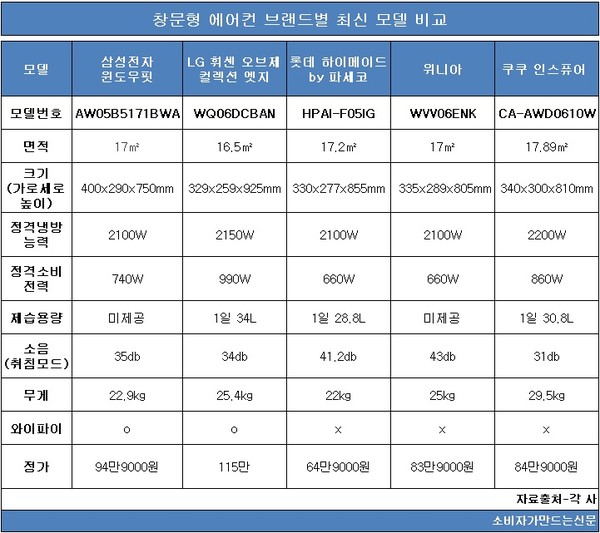 창문형 에어컨에서 가장 많이 쓰는 면적인 17㎡(5~6평)를 기준으로 삼성전자(대표 한종희·경계현)의 '윈도우핏', LG전자(대표 조주완·배두용)의 'LG 휘센 오브제 컬렉션 엣지', 롯데하이마트(대표 황영근)와 파세코(대표 유일한)의 '롯데 하이메이드 by 파세코', 위니아(대표 최찬수)의 창문형 에어컨, 쿠쿠홈시스(대표 구본학)의 '쿠쿠 인스퓨어' 등 각 최신 모델의 스펙을 비교해 봤다. 작년에 출시된 위니아를 제외한 전 모델이 모두 올해 새롭게 출시됐다.