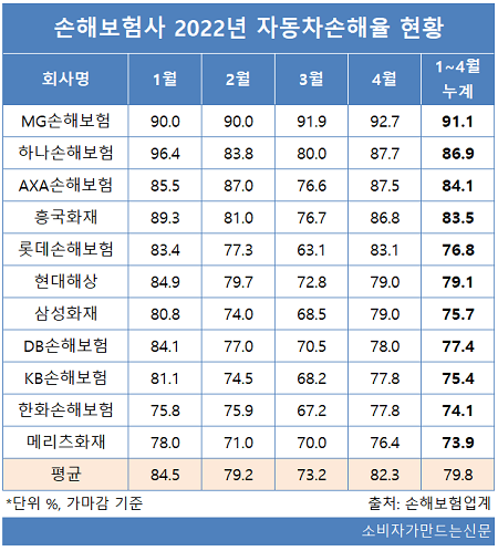 18일 손보업계에 따르면 4월 기준 손보사의 자동차 손해율은 평균 82.3%로 전월 73.2% 대비 9.1%포인트 상승했다.