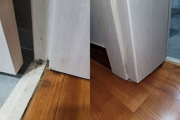 화장실 문틀과 바닥 사이 실리콘 작업이 전혀 돼있지 않아 항의하자 작업자는 "실리콘 작업은 원래 하지 않는다"며 나몰라라 했다.