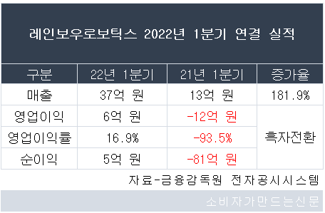 레인보우로보틱스는 올 1분기 연결 매출이 전년동기 대비 181.9% 증가한 37억 원을 기록했다고 23일 공시했다. 영업이익과 순이익은 각 6억 원, 5억 원으로 흑자 전환했다. 영업이익률은 16.9%다.