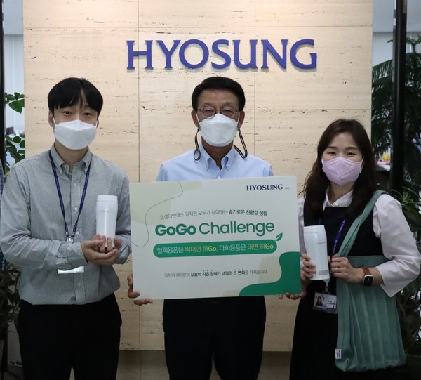 효성티앤에스는 사내 공모를 통해 ‘일회용품은 비대면하Go, 다회용품은 대면하Go’ 슬로건으로 선정하고 적극적인 실천을 다짐하는 자리를 가졌다.