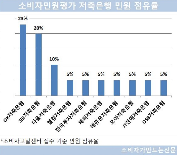 SBI저축은행이 20%, 다올저축은행이 10%로 뒤이었다. 웰컴저축은행, 한국투자저축은행, 페퍼저축은행, 애큐온저축은행, 모아저축은행, JT친애저축은행, OSB저축은행 등은 민원점유율이 5%로 동일했다.
