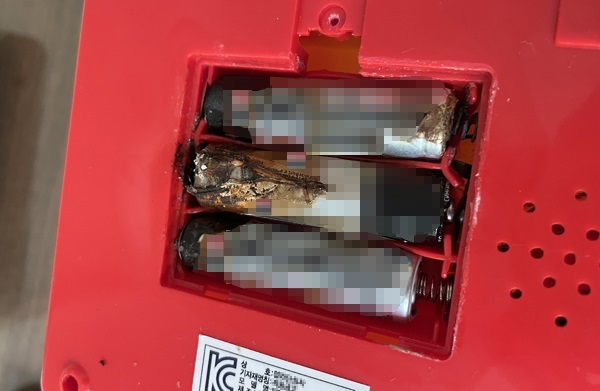 완구의 건전지 덮개는 날아갔고 끼워둔 건전지 3개 모두 내부가 보일 정도로 터진 상태였다.