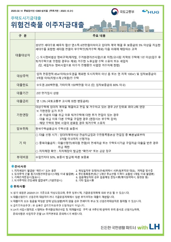 박동선 LH 지역균형발전본부장은 "금리가 지속적으로 상승하고 있는 상황에서 1.3%의 저렴한 금리로 이주자금을 지원함으로써 위험건축물로부터 국민을 보호하고 정비구역 거주자의 주거불안 해소에 기여할 수 있을 것으로 기대된다"고 말했다.