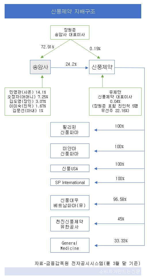 지배구조 정점에 위치한 인물은 오너 2세 장원준 신풍제약 전 대표이사다. 송암사는 신풍제약 지분 24.2%로 최대주주인데, 장 대표는 송암사 지분 72.9%를 가지고 있다. 다음으로 넷째 누나인 장지이 씨의 시아버지 민영관 씨(85)가 14.1% 지분을 가지고 있다. 이어 어머니 오정자 씨(85) 7.25%, 장인 김도영 씨(73) 3.1%, 친인척 이미숙 씨(67) 1.7%, 아내 김문선 씨(43) 1% 순이다.