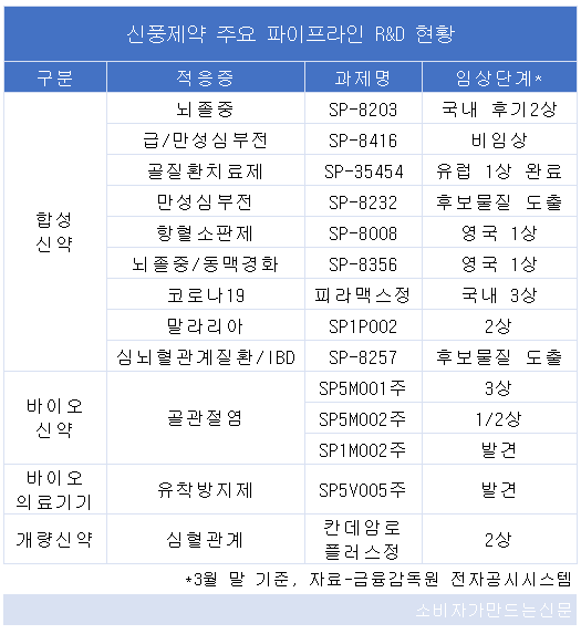 개발에 특히 힘을 쏟는 물질은 급성 허혈성 뇌졸중 혁신신약 후보물질 SP-8203(오탑리마스타트)다. 지난 30년여 유효성을 입증하지 못한 뇌졸중 신약만 100개가 넘고 뇌졸중의 85%가 허혈성이다 보니 SP-8203에 거는 기대가 크다는 설명이다.