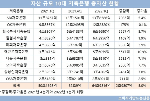 각사 분기보고서에 따르면 지난 1분기 자산 규모 상위 10개 저축은행의 총자산은 전년 말 대비 5% 증가한 64조9816억 원이었다. 전년 동기 대비로는 약 14조8000억 원 가량 늘었다.