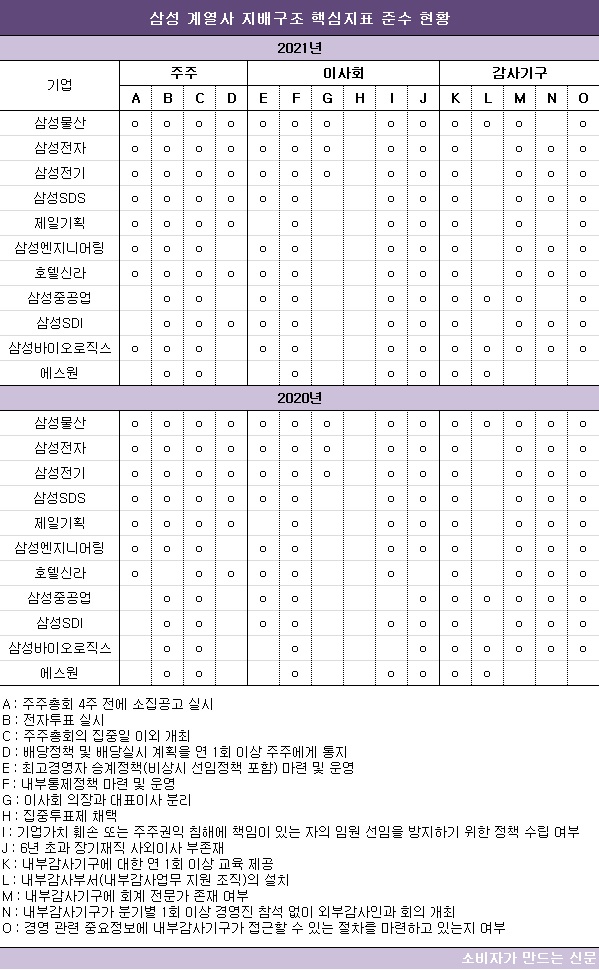 금융감독원 전자공시시스템에 따르면 기업지배구조 보고서를 통해 핵심지표 이행현황을 공시하는 삼성그룹 계열사는 11곳이고, 이들은 지난해 핵심지표 가이드라인 15개 중 평균 11.3개를 준수했다.