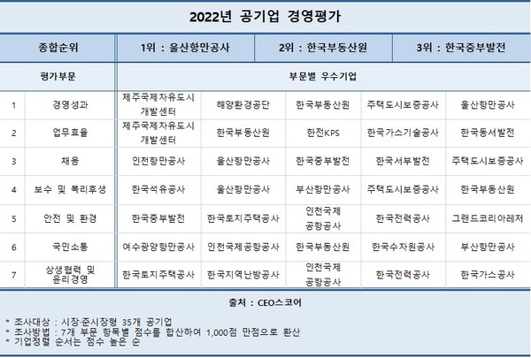 이번 평가는 기획재정부가 공시한 2022년도 공공기관 경영평가편람을 참고해 평가 지표를 선정, 각 항목별 합계 총점 1000점으로 환산했다. 크게 경영성과·업무효율이 포함된 ‘재무부문’, 채용·안전·상생협력 등 나머지를 ‘비재무부문’으로 각각 50:50 비율씩 나눠 평가했다.