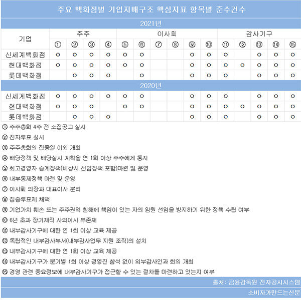 소비자가만드는신문이 기업 지배구조 보고서를 공시하고 있는 백화점 3사의 지배구조 핵심지표 준수 현황을 살펴본 결과 주주와 이사회 감사기구 세 부문을 통틀어 지난해 평균 11.7건을 준수한 것으로 집계됐다.
