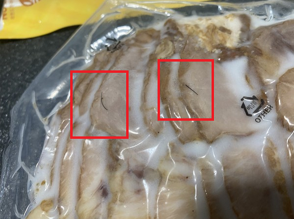 최 씨는 “처음에는 돼지 털이라 생각해서 대수롭지 않게 여겼으나, 자세히 살펴보니 털이 자라는 위치가 아니라 살코기 부분에 있었다”며 불쾌해 했다.