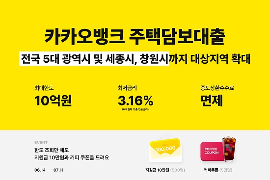 카카오뱅크는 주담대 지역 확대를 기념해 오는 14일부터 다음 달 11일까지 한도조회 이벤트를 진행한다.