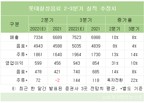 3분기 전망도 좋다. 매출은 7523억 원으로 지난해 3분기보다 8% 늘고, 영업이익은 943억 원으로 10% 성장할 것으로 분석됐다. 음료 부문은 매출이 5035억 원으로 4% 늘고, 영업이익은 740억 원으로 8% 성장할 것으로 예상됐다. 주류 부문은 매출이 1730억 원으로 전년동기 대비 14% 늘고, 영업이익은 144억 원으로 22% 늘 것으로 보인다.