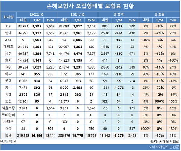 17일 손해보험협회에 따르면 올해 1분기 전체 손해보험사의 TM채널 보험료는 1조6496억 원으로 전년 동기 1조9775억 원 대비 3279억 원(17%) 줄었다.