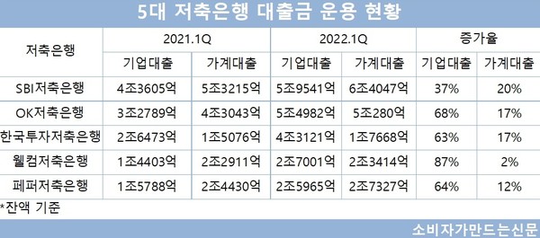 실제로 자산 규모 기준 5대 저축은행의 기업자금대출 잔액은 1분기 기준 13조3058억 원으로 전년 동기 대비 58%나 증가한 반면, 가계자금대출 잔액은 같은 기간 15% 증가하는데 그쳤다.