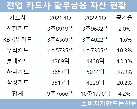 할부금융 사업이 대표적이다. 지난 1분기 기준 현대카드를 제외한 자동차 할부금융을 취급하는 6개 전업 카드사의 자산 합계는 10조1770억 원으로 지난해 말 기준 9조7666억 원과 비교해 4.2% 증가했다.