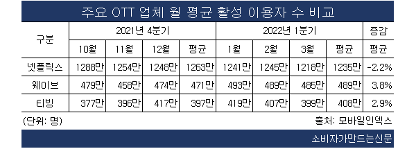 웨이브는 전년 1분기 474만 명보다 3.8%, 티빙은 417만 명보다 2.9% 성장하며 두 업체모두 꾸준하게 이용자 수를 늘려나가고 있다.