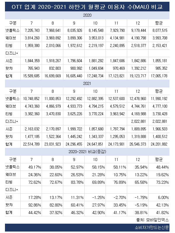 하지만 티빙은 여기에 만족하기 어렵다. 2021년 하반기 티빙의 MAU는 373만 명으로 2020년 215만 명보다 73.23% 늘며 ‘폭풍성장’하는 모습을 보였다.