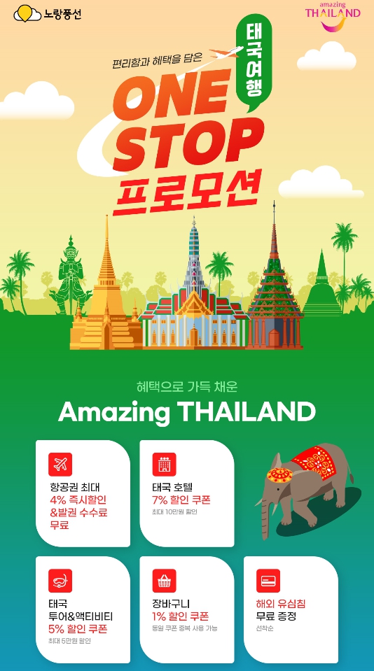 이번 프로모션을 통해 예약할 경우에는 △항공권 최대 4% 즉시 할인 △발권 수수료 무료 쿠폰 △호텔 최대 7% 할인 쿠폰 △투어&액티비티 3% 할인 쿠폰을 제공한다. 이 외에도 1% 장바구니 할인쿠폰과 동남아시아에서 사용이 가능한 해외 유심카드를 증정하는 이벤트를 진행한다.