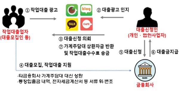 범죄 조직은 전단지, 인터넷 카페 등 광고를 통해 대출이 곤란한 금융소비자에게 접근 후 견적서, 세금계산서 등 대출에 필요한 서류를 위·변조하여 정상적인 대출로 위장하는 방법으로 부당 작업대출이 일어나도록 주도했다.