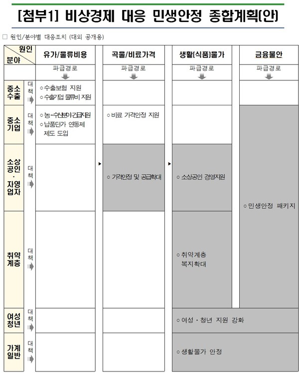 5대 긴급대책에는 ▲농어업인 면세유 및 물류비 지원 ▲비료 가격안정 지원 ▲수출보험지원 ▲수출기업 물류비 지원 ▲납품단가 연동제 제도 도입 촉구 등이 포함됐다.