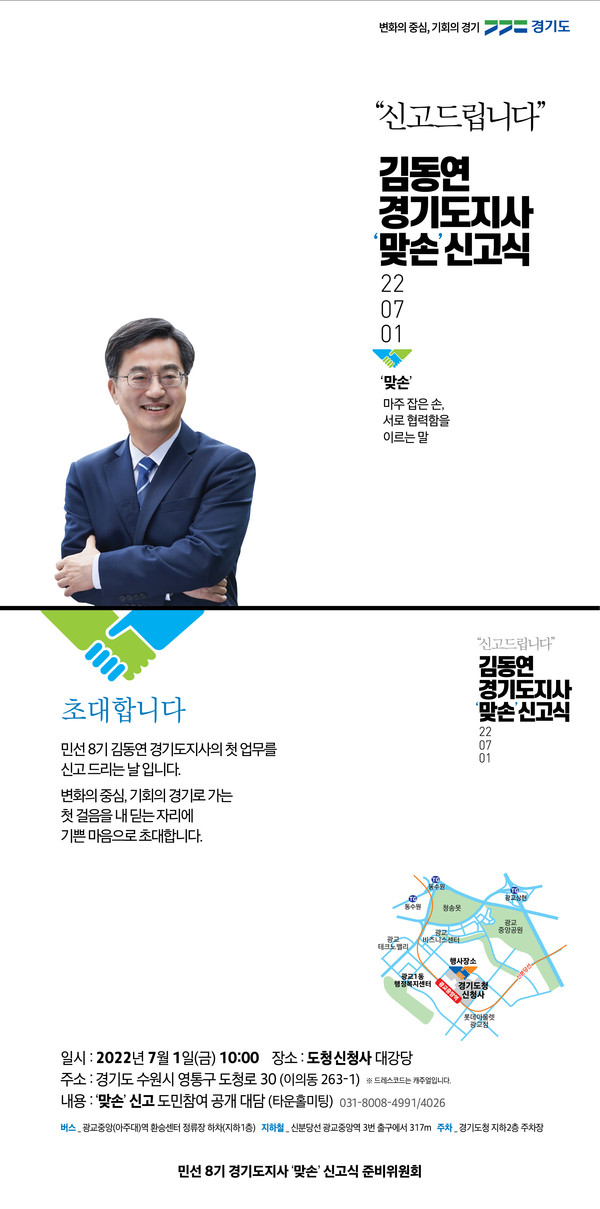 인수위는 타운홀미팅을 통해 소통·협력·헌신이라는 취임식의 열쇳말을 구현한다. 낮은 자세로 도민의 의견을 듣고 소통하겠다는 취지다. 맞손 신고식 취임식 전체 행사는 7월 1일 오전 동안 진행된다. 김동연 당선인은 이날 오전 8시 30분 청년, 노동자, 농민, 스타트업 대표 등 도민을 대표하는 10여 명과 함께 수원시 인계동 소재 현충탑을 참배하는 것으로 첫 일정을 시작한다.