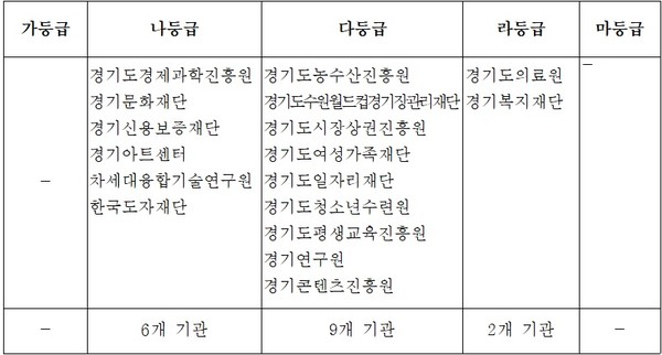 반대로 경기도일자리재단과 경기연구원은 나등급에서 다등급으로, 경기복지재단은 다등급에서 라등급으로 떨어졌다.