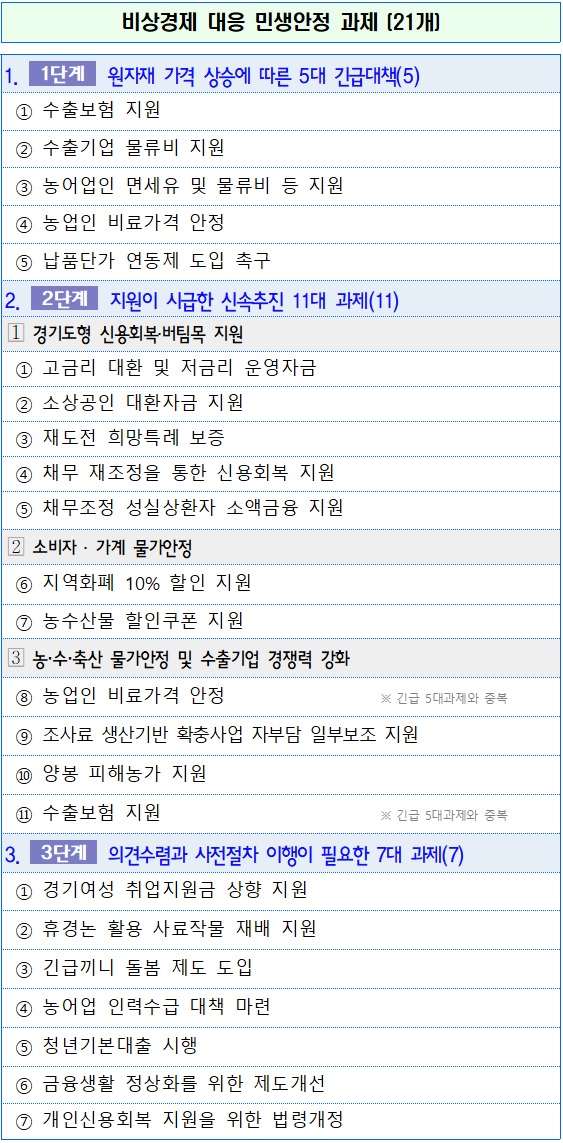 수출기업 1개 사 당 최대 300만 원까지 물류비를 지원하고, 농가에는 올해 무기질 비료 가격 인상분의 80%를 지원하는 등 긴급 민생안정 대책을 골자로 한다.
