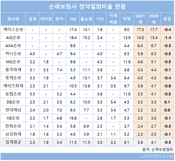 AXA손해보험과 하나손해보험이 각각 6.4%, 5.8%로 뒤를 이었다. 두 손보사 모두 전체적으로는 전년보다 개선됐지만 TM채널에서 각각 9%대로 높은 청약철회율을 기록하며 전체 수치를 끌어올린 탓으로 보인다.