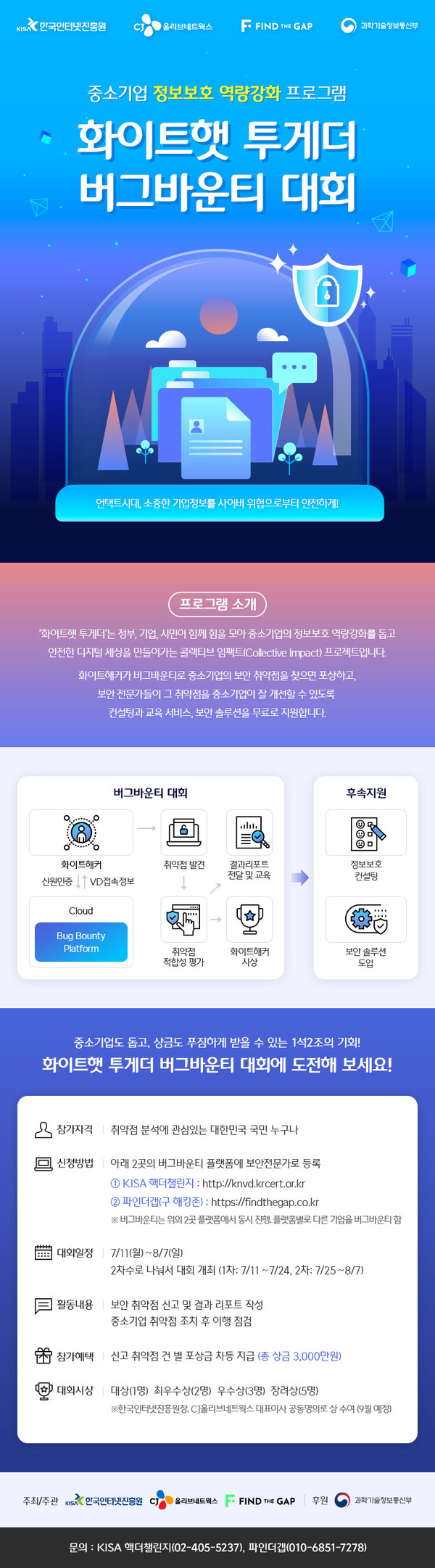 중소기업의 정보보호 역량강화 및 건강한 정보보호 생태계 조성을 위한 ‘화이트햇 투게더’ 프로그램 의 일환으로 개최하는 이번 버그바운티 대회는 CJ올리브네트웍스, 파인더갭과 함께 진행한다.