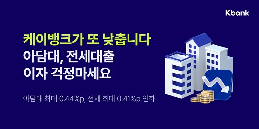 케이뱅크는 12일부터 아담대와 전세대출 금리를 각각 최대 연 0.44%포인트, 연 0.41%포인트 내린다고 밝혔다.