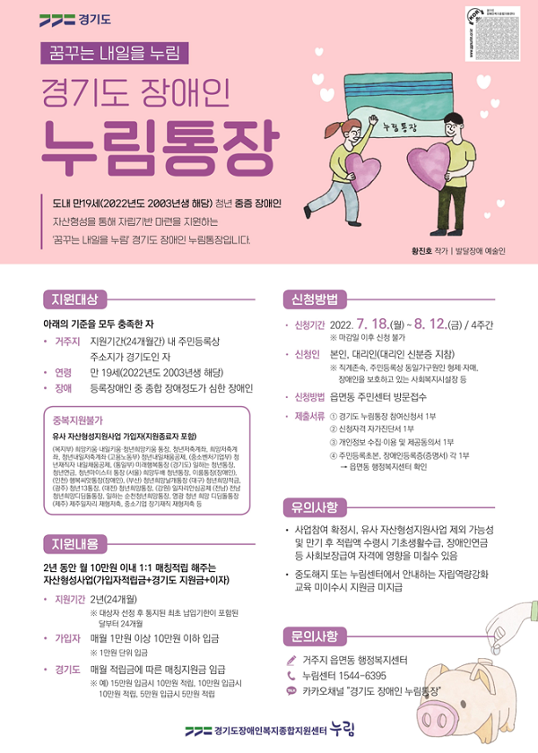 도는 월 10만 원씩 저축하면 10만 원 추가 지원하는 ‘장애인 누림통장’ 신청을 받는다고 12일 밝혔다. 정부와 지자체의 청년 지원 사업 혜택을 제대로 받지 못하는 도내의 중증 장애인 청년의 자산 형성을 지원하기 위해 실시한다.